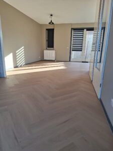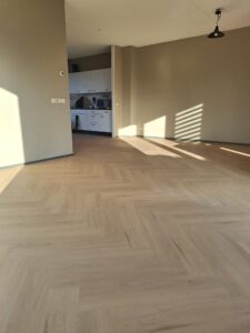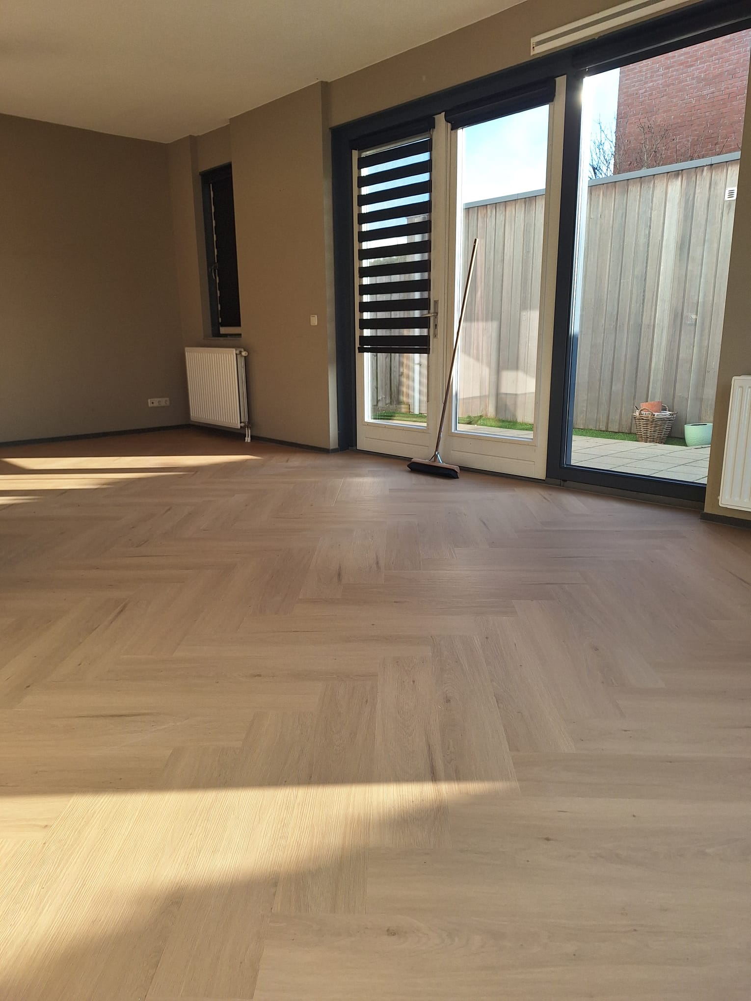 Daarna was het tijd voor de echte blikvanger: een prachtige PVC visgraatvloer. Tijdloos, modern en perfect passend bij een nieuw (t)huis.